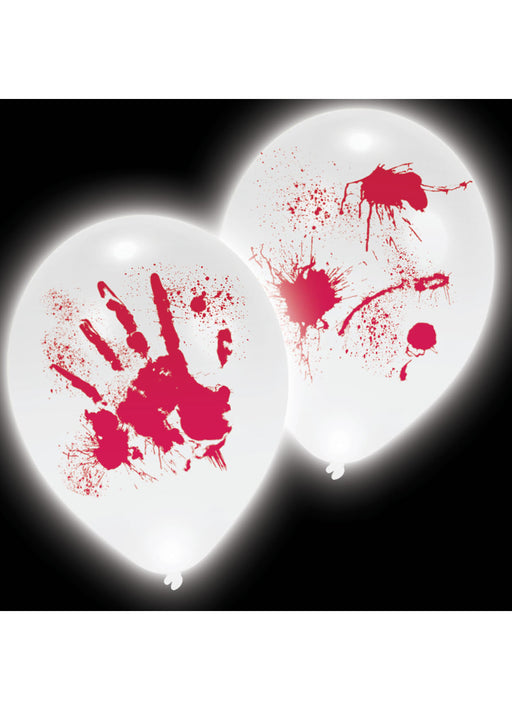 Pack of 4 latex 11" balloons with bloody hands print containing LED lights. Lights last for up to 24 hours.