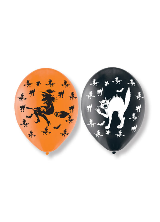 Pack of 6 Halloween themed air fill latex balloons decorated with witch on broom & witch's cat print. Each pack contains 3 orange & 3 black...