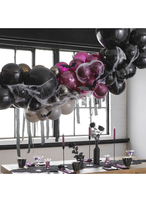 Classy DIY Halloween themed balloon arch decoration with 65 purple, black, grey and grey chrome balloons in 5, 10, 12 and 18 inch, 8 black card bat...