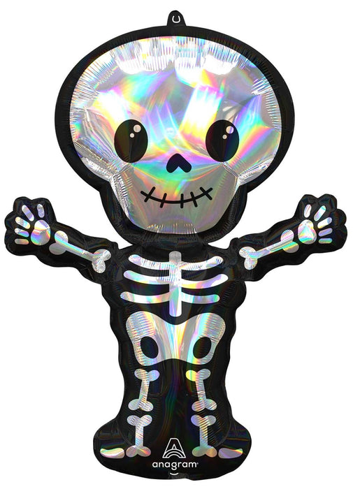 Holographic friendly Skeleton character Halloween foil balloon measuring 66 cm x 86 cm (26" x 34") when inflated.