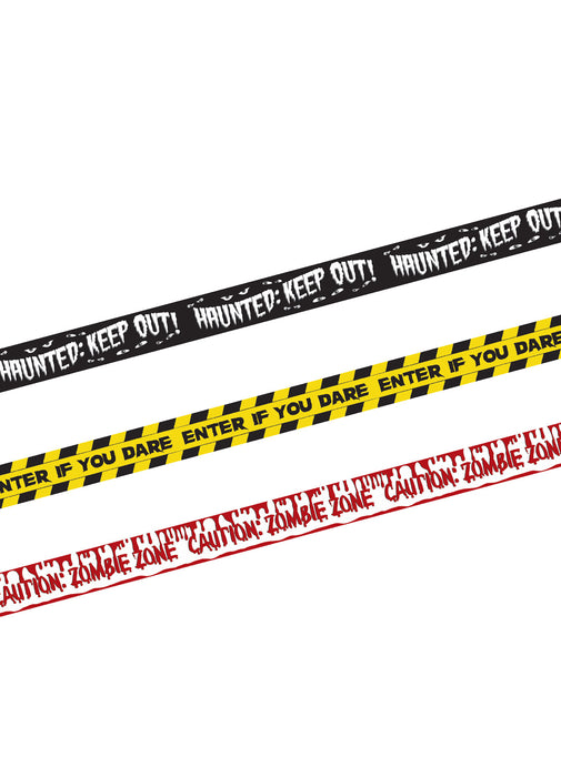 Pack of three different ghoulish designs of Halloween fright tape each 30ft long. Consists of: Enter If You Dare, Zombie Zone Caution and Haunted Keep Out.