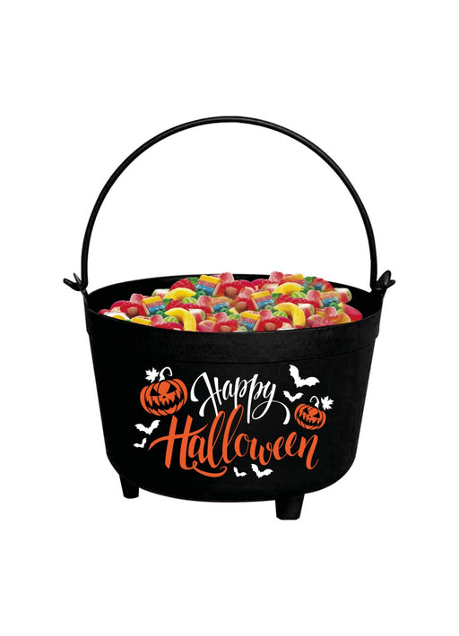 Black Halloween cauldron measuring approx 24 cm diameter with the message "Happy Halloween" on two sides.
