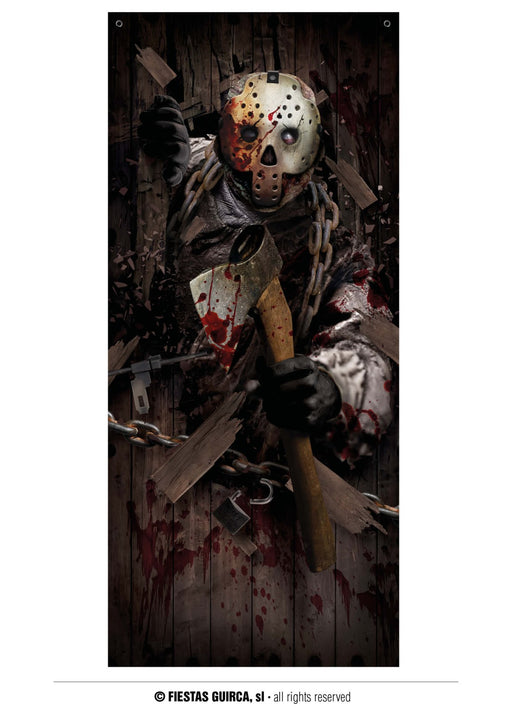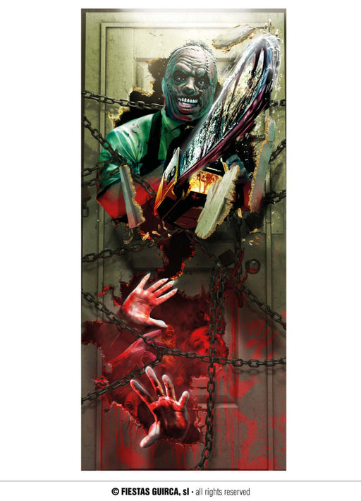 Halloween chainsaw killer door decoration measuring 180 cm x 80 cm.