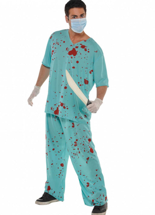 Halloween unisex scrubs splattered in blood. This one size fits most costume pack comes with elasticated trousers and shirt.