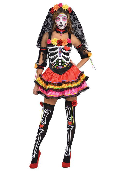 Day of the Dead themed Senorita fancy dress costume consisting of colourful layered dress with skeleton print design, black netted arm sleeves, thi...
