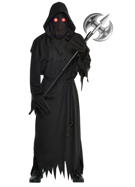 Long black jagged cut robe, hood with mesh, mask with LED red eyes, pointed gloves and rope belt. Weapon not included. Size Chest Waist Inside ...