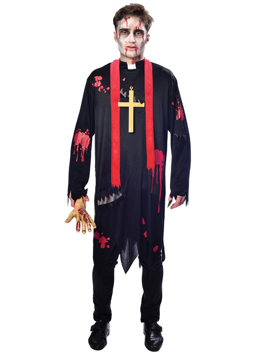 Horror Halloween zombie priest fancy dress costume with blood splattered robe with dog collar, red scarf and gold cross.