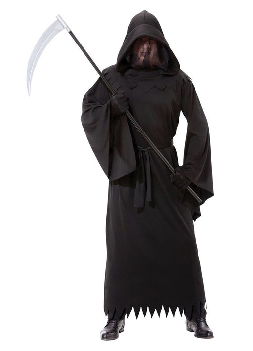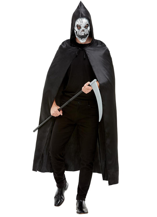 This great value Halloween costume kit comes with grim reaper latex face mask, scythe weapon and black hooded 3/4 length cape.