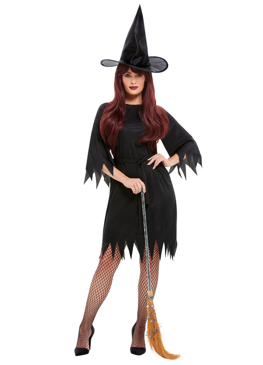Black budget traditional Halloween witch costume with dress, belt and pointy hat. Size Dress Bust Waist Hip Small 8-10 34 ½''-35 ½'' 26 ½''-27...