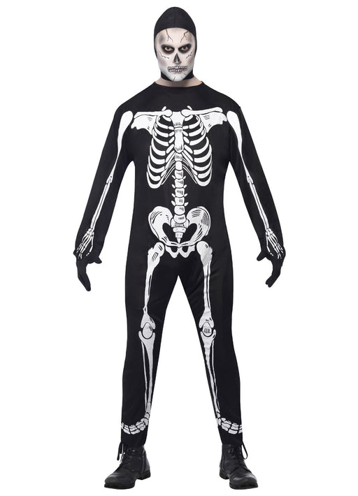 Adult Halloween skeleton costume includes black jumpsuit with printed skeleton bones, black hood and gloves. Size Chest Waist Inside Leg Med...