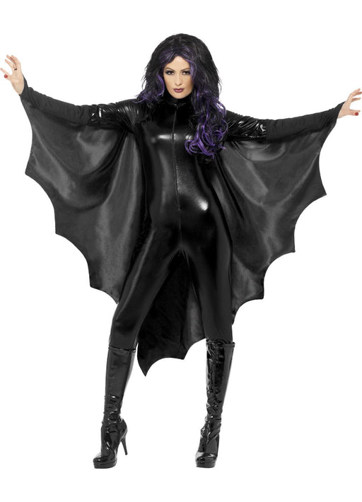 Vampire bat wings adult consisting of black wing shaped cape with black collar and attached arm cuffs for wing effect. Comes in one size.