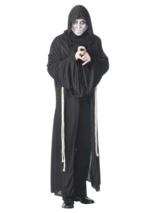 Phantom of darkness Halloween fancy dress costume consisting of long black robe with attached hood and mask. Also included is the black waist sash.
