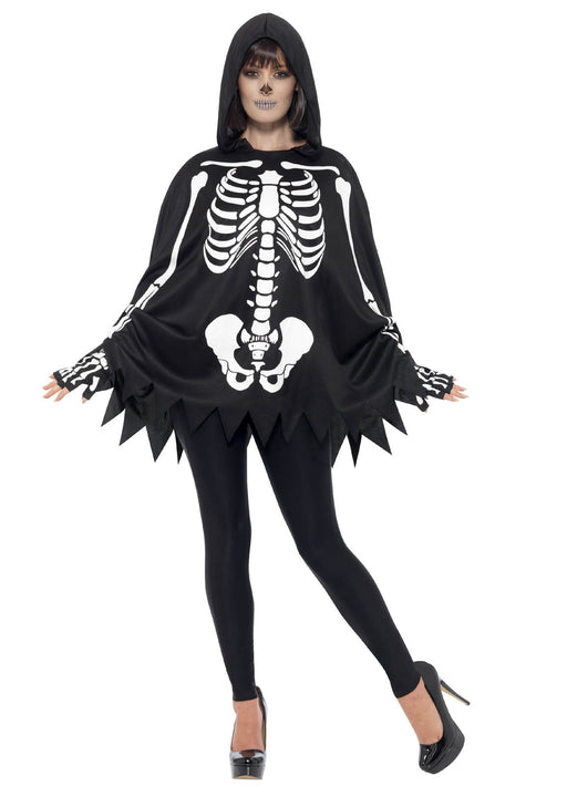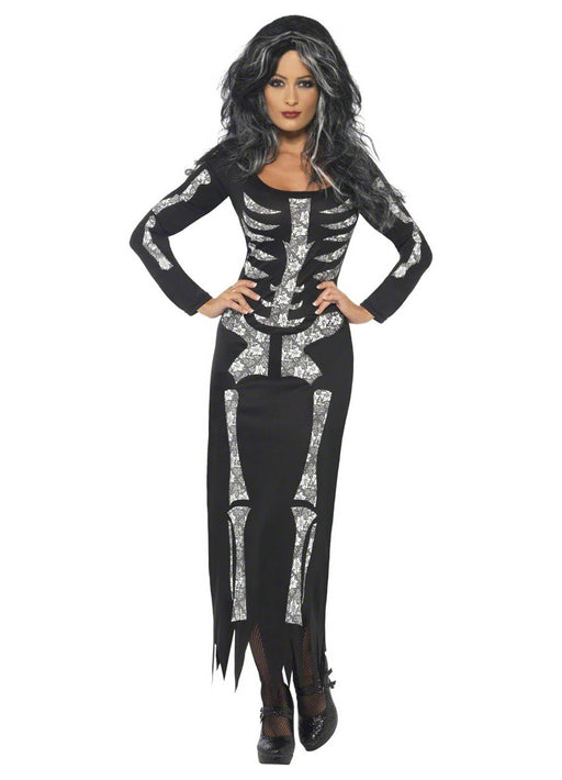 Adult female skeleton Halloween costume consisting of long black polyester tube dress with long sleeves finished with skeleton print. Size Dre...