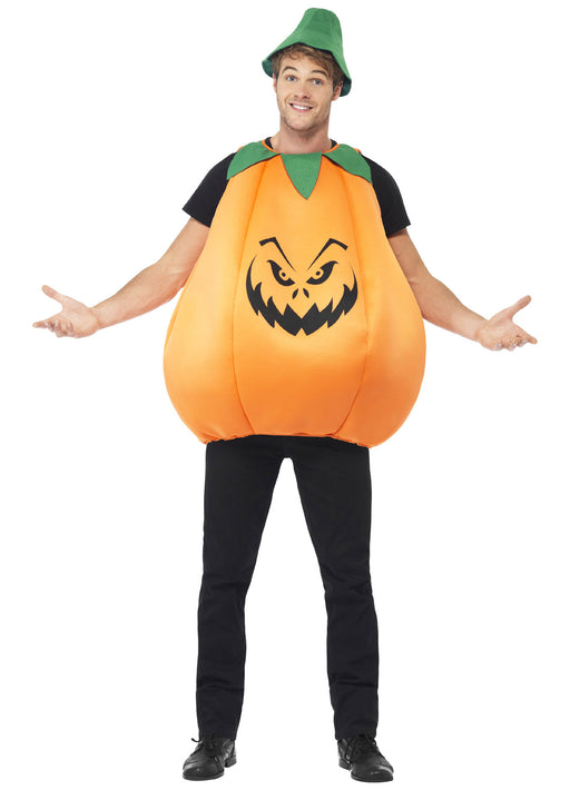 Sinister pumpkin unisex fancy dress costume consisting of orange padded tabard with arm slots, green collar section & black pumpkin face print....