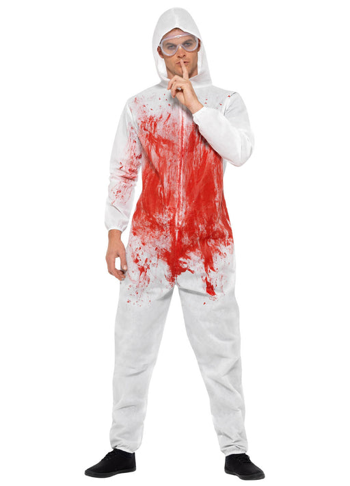 White forensic style overall with hood and zip up front cover in blood. Also includes pair of plastic googles. A great value Halloween costume! ...
