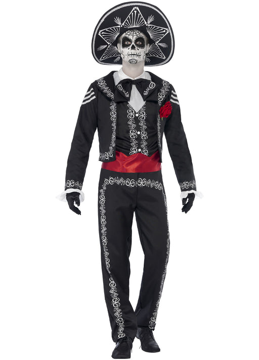 Day of the Dead themed Señor Bones fancy dress costume consisting of elasticated black trousers, sleeveless black top with attached white shirt an...