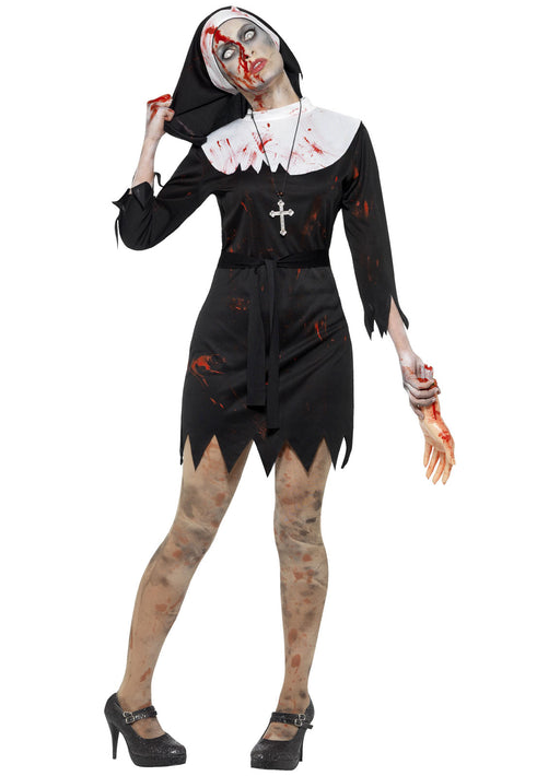 Zombie Sister fancy dress costume consisting of short black Nun's dress with bloodstain design, matching headpiece, black waist sash & matching...