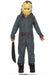 Halloween horror costume with hockey face mask and all in one bloodied jumpsuit.