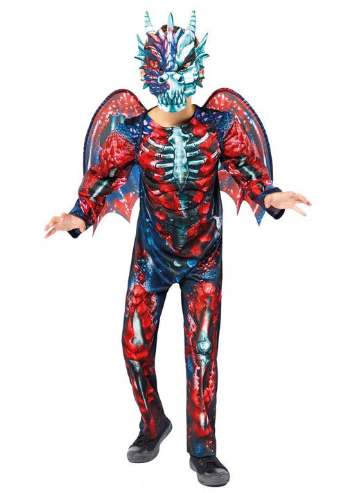 Halloween Deadly Dragon fancy dress costume with printed jumpsuit with muscle chest and shoulders, face mask and wings.