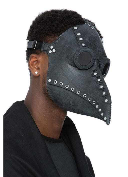 Officially licensed Squid Game Front Man character black plastic face mask with black elastic strap.