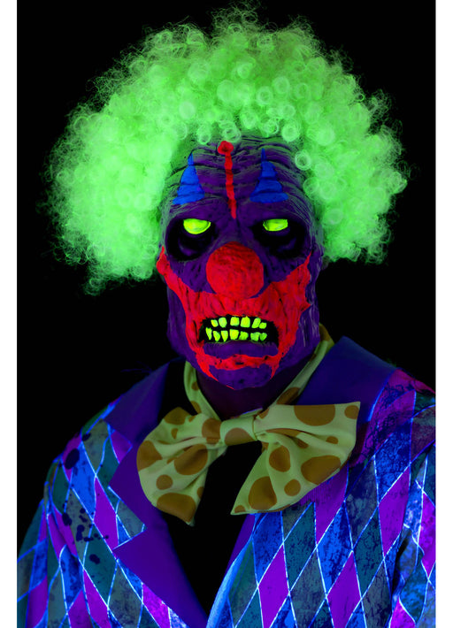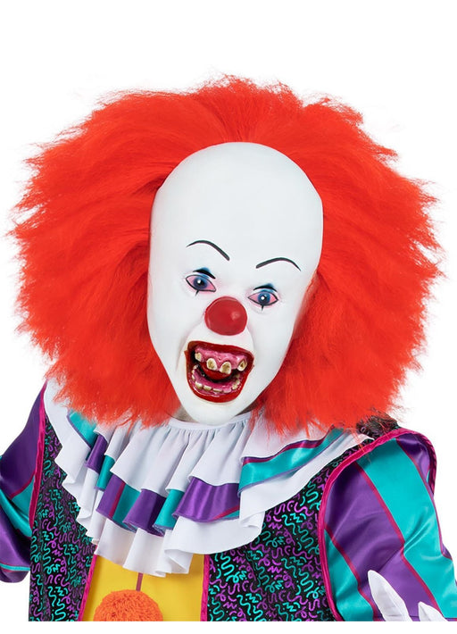 Full overhead Twisted Clown latex mask with hypnotic eyes and red curly hair.