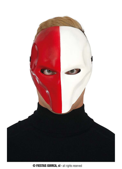 Half and half red and white PVC Halloween face mask with black elastic strap.