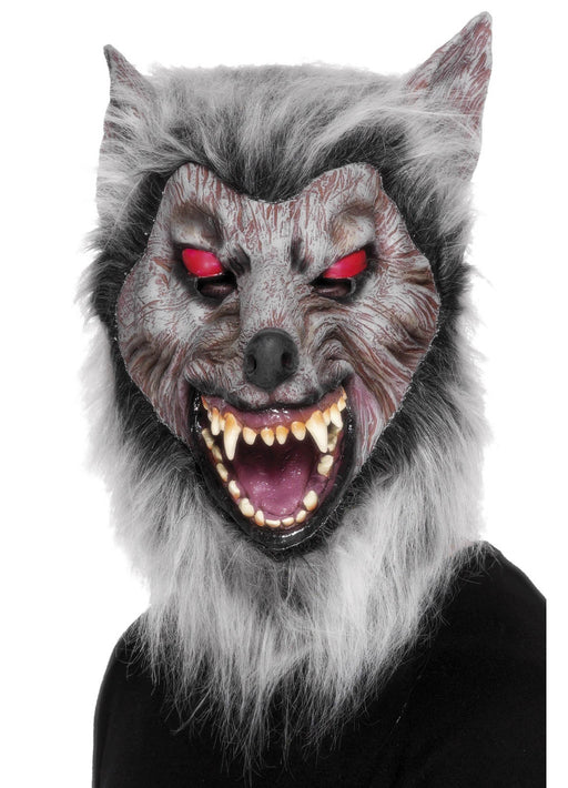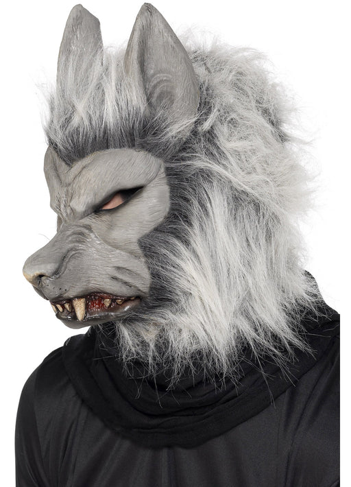 Full overhead rubber latex horse head mask with fur mane, nostril holes & mouth opening.