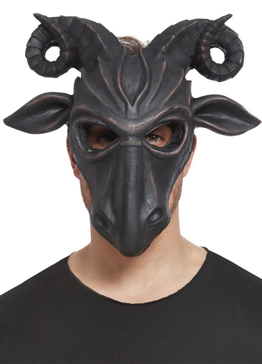 Masquerade flesh effect face off prosthetic mask with adhesive. Add some fake blood to get the pictured look.