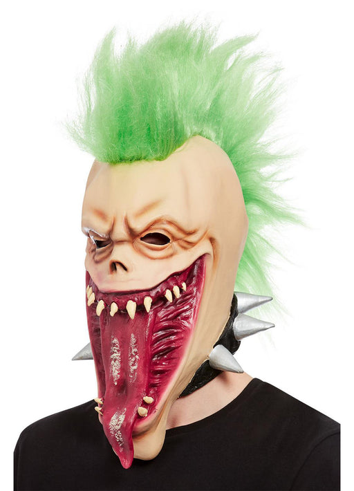 Deluxe Halloween punk skull overhead latex mask with studded choker effect and spiky green hair.