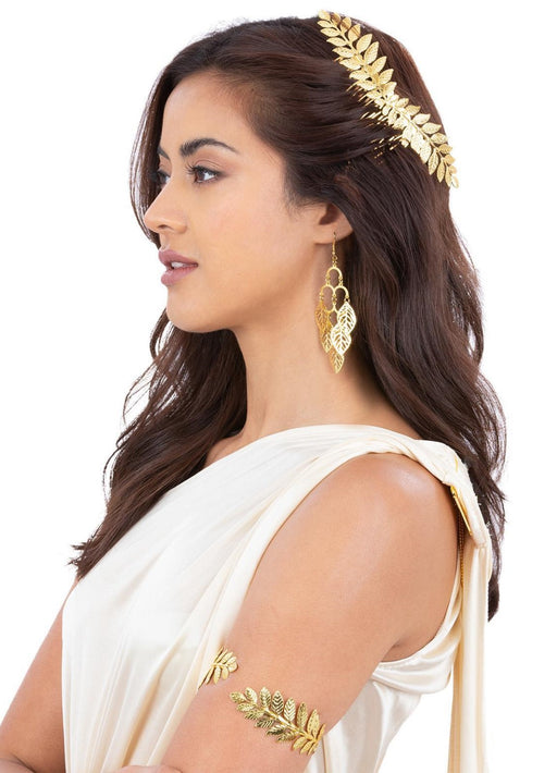 Historical gold leaf fancy dress headpiece jewellery set with hair slide, earrings and arm cuff.