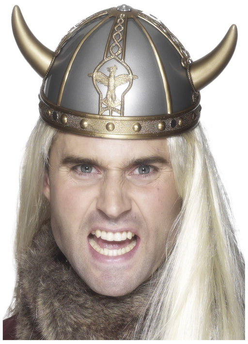 Plastic silver Viking helmet with horns decorated with gold trim and design.