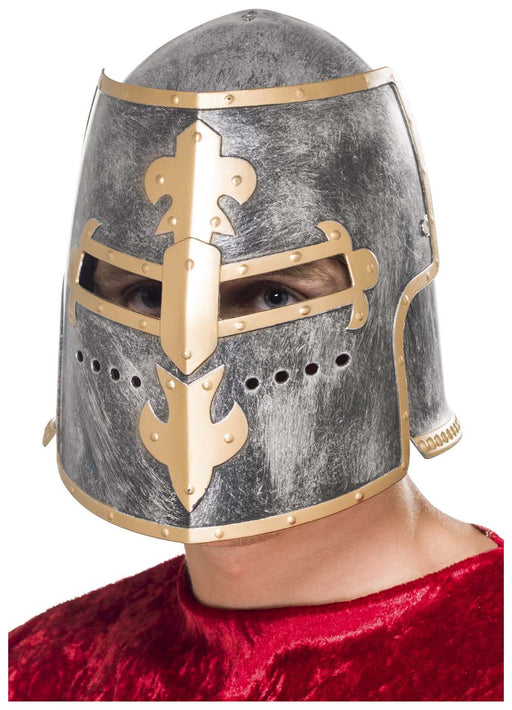 Medieval style hinged crusader helmet which allows the product to be worn open or closed. Helmet is finished off with gold trim and holes for sight.