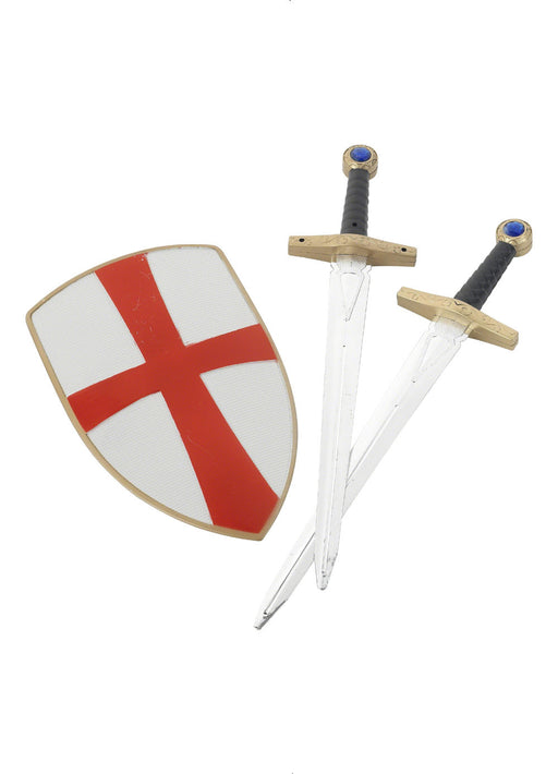 Child's Knight Crusader set with two swords (each 50cm/20inch long) and a shield (30cm x 20cm). Suitable for ages 3+. Please note shield may come i...