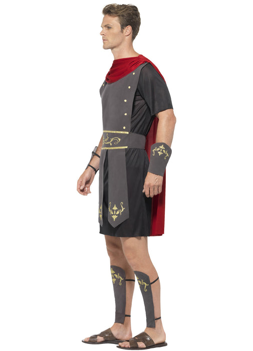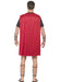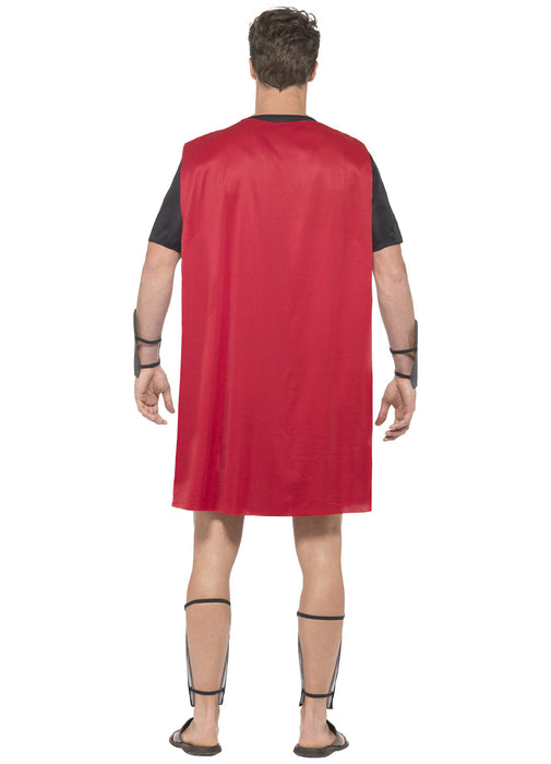 Roman Gladiator fancy dress costume consisting of long brown tunic with gold detail print, attached red cape, pair of arm cuffs & matching leg cuffs.