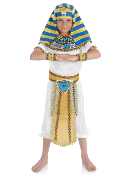 Child's Egyptian boy costume consisting of long white velvet effect tunic with decorative trim, detachable neck collar, gold waistband, pair of wri...