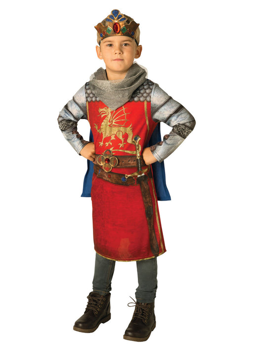 Medieval King Arthur fancy dress costume consisting of red printed tunic with sword design, blue cape, felt crown with attached jewels & chain ...