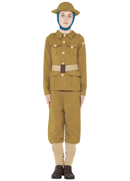 World War 1 Soldier costume child from the Horrible Histories collection. Costume includes beige elasticated trousers with attached light lower sec...