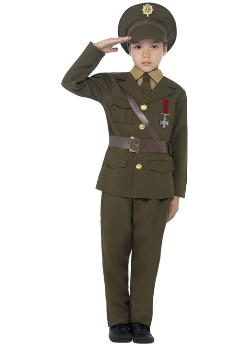 Child's army officer costume consisting of dark green jacket with attached belt, buttons and medal, mock shirt and tie, elasticated trousers & ...