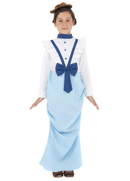 Child's Victorian fancy dress costume ideal for World Book Day. Comes with a mini brown hat with blue ribbon on a headband along with a long sleeve...