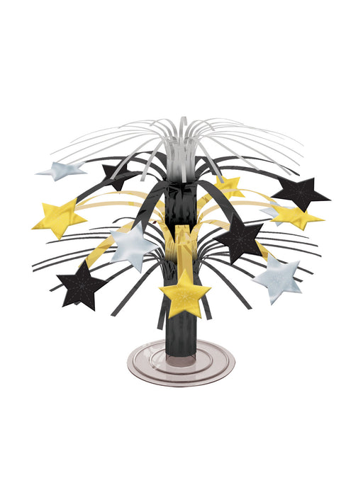 Hollywood themed mini cascade centerpiece with attached black, gold & silver foil stars measuring 7.5" in height.