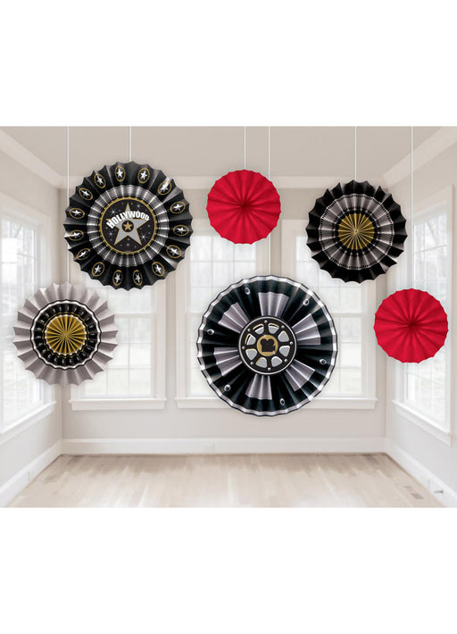Pack of 6 Hollywood themed paper fan decorations decorated with relevant images and colours.