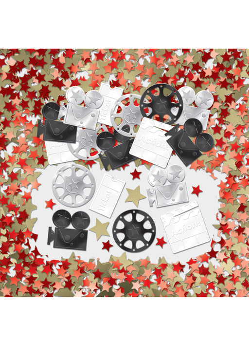 Hollywood themed table confetti shapes consisting of gold stars, red mini stars, black and silver film reels & white clapper boards. Each bag c...