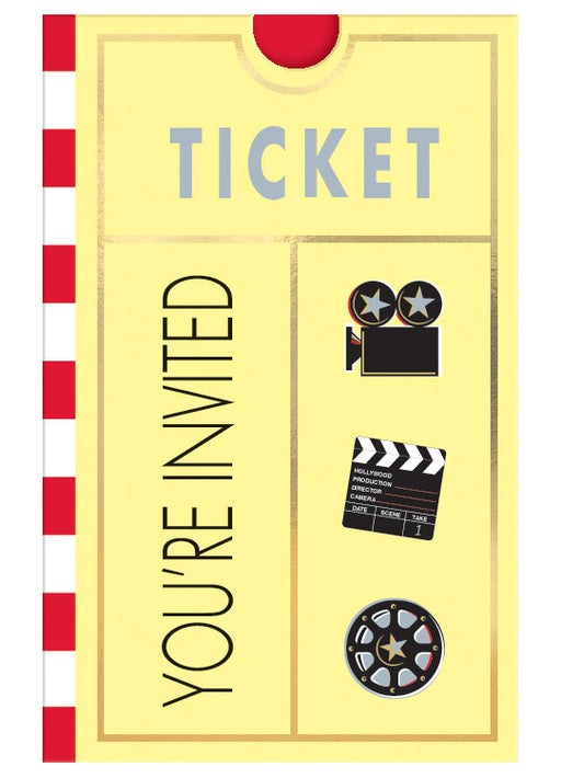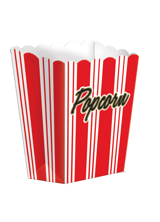 Pack of 8 Hollywood themed red and white striped popcorn boxes. Measures approximately 3.75" x 5.25" x 1.5".