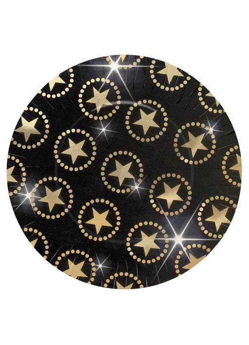 Pack of 8 Hollywood paper plates decorated with gold stars & swirls measuring 27cm in diameter.