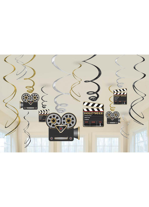 Pack of 12 Hollywood themed swirl decorations with attached film & clapper board cutouts.
