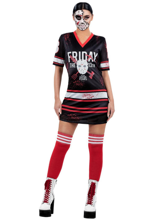 Licensed printed hockey dress with v-neck design from the horror film Friday the 13th. Face mask or make-up available separately. Size Dress Bus...