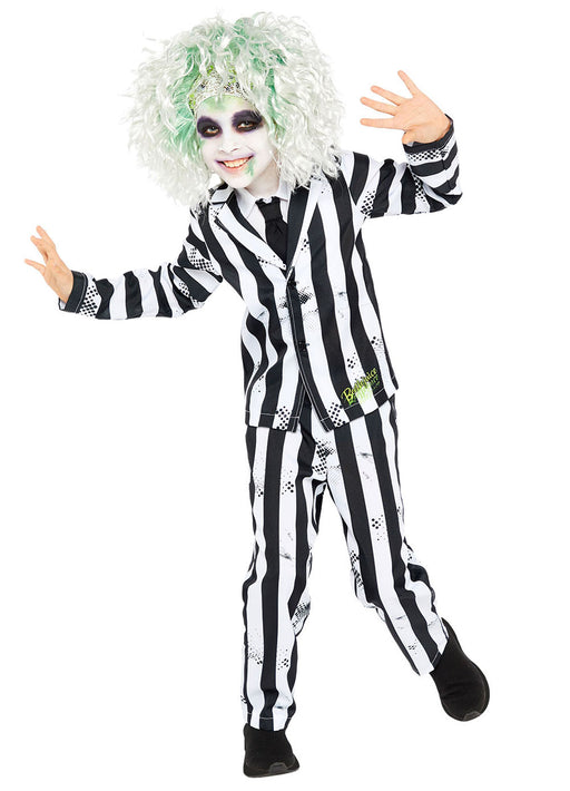 Officially licensed Beetlejuice baby and toddler sized Halloween costume consisting of all in one printed black & white jumpsuit.