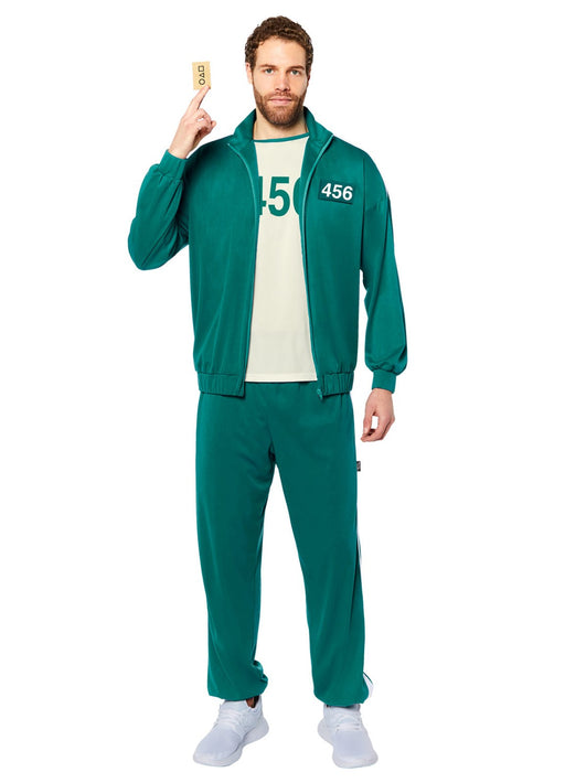 Player 456 officially licensed Netflix Squid Game unisex costume from the hit show with green tracksuit top and trousers along with numbered t-shir...