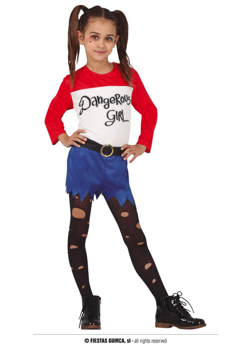 Crazy Dangerous harlequin Halloween costume with t-shirt and blue shorts with belt. Tights not included with costume pack.