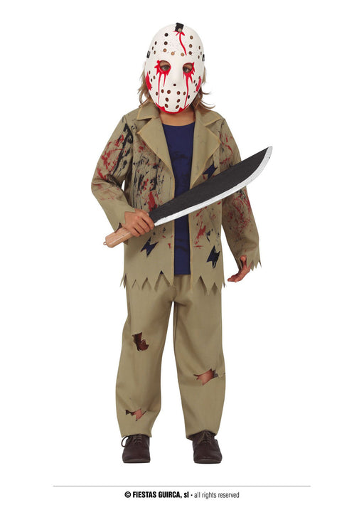 Horror Halloween Jazz Dead costume with white bloodied hockey face mask, khaki jacket with attached blue top and trousers.